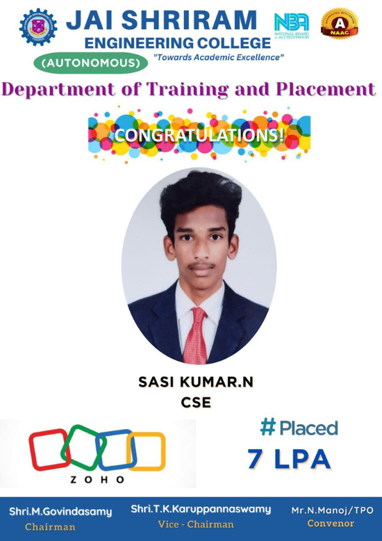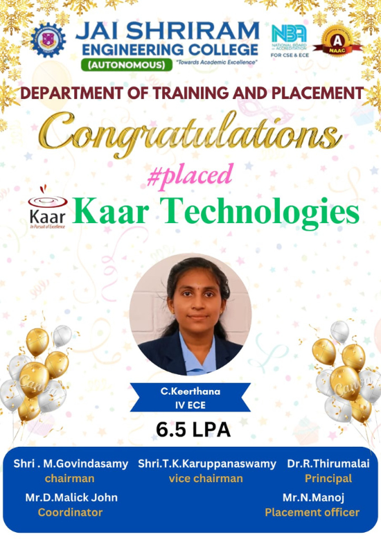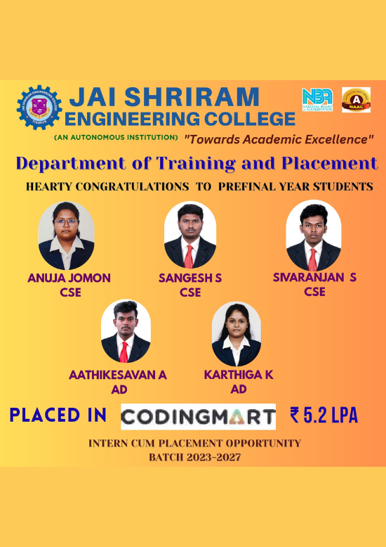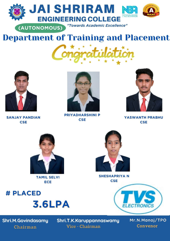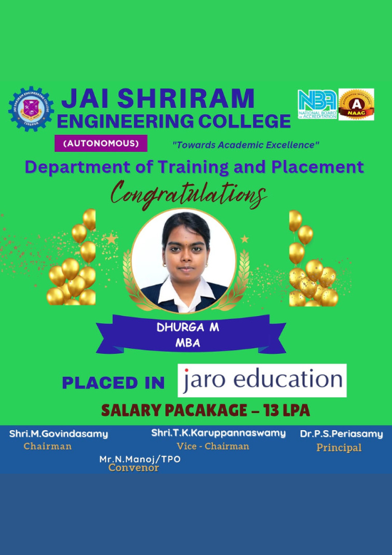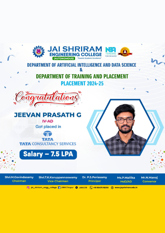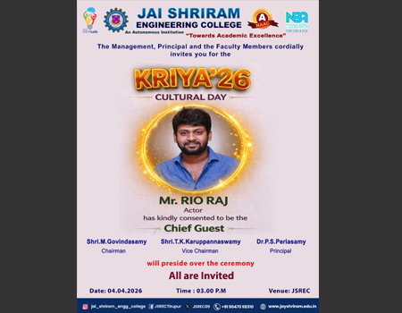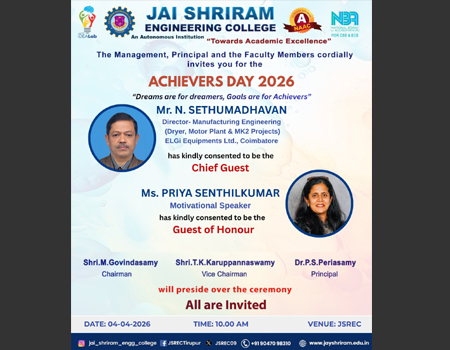 Jai Shriram Engineering College was endowed by Shenthil Velevan Trust in the year 2009 with a motto of equipping and implanting the seed of higher education blended with communal harmony to the rural community in and around the Textile City. JSREC reinforces to impart knowledge which are innards of a meaningful life.