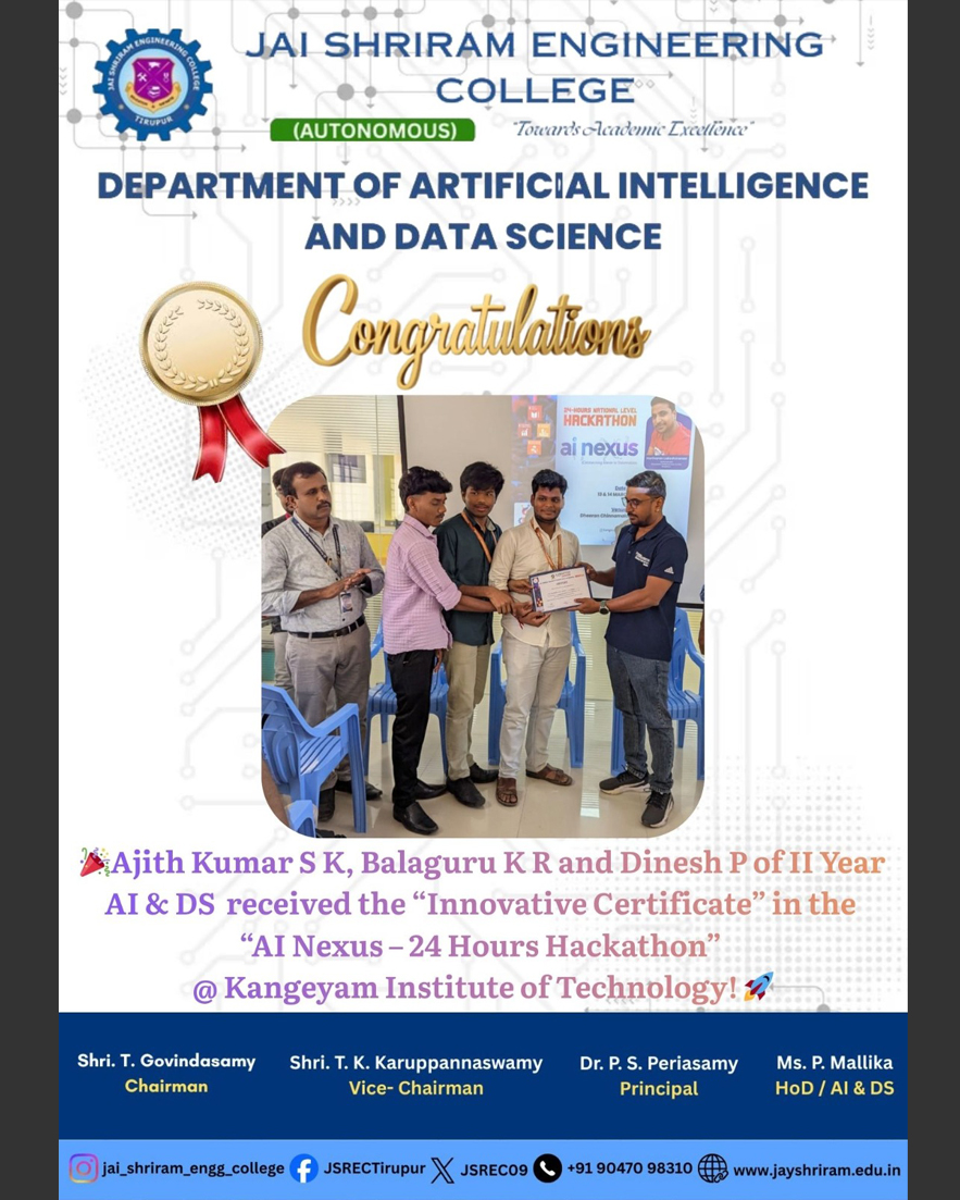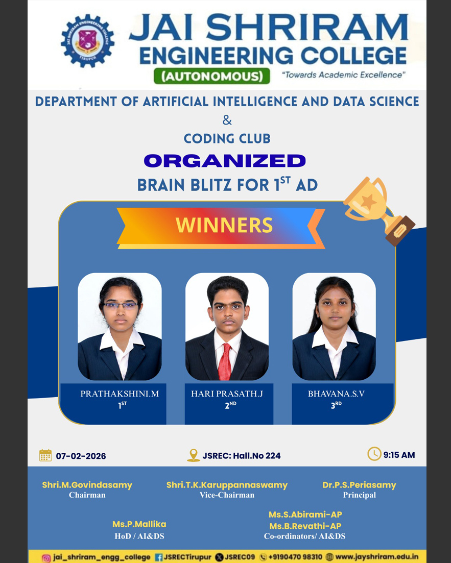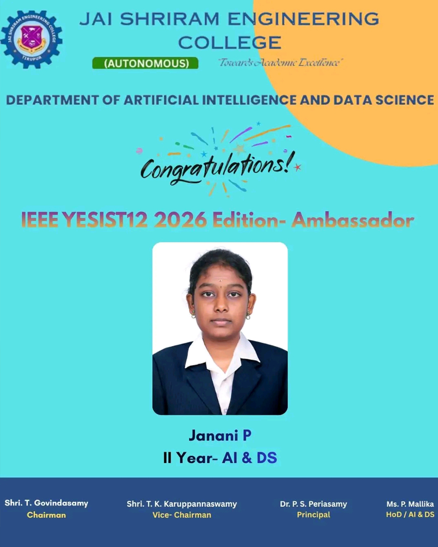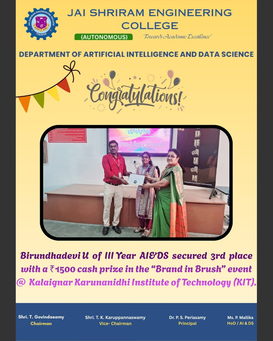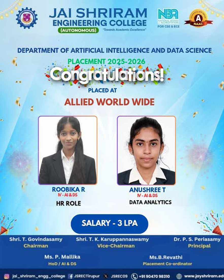 The Department of Artificial Intelligence and Data Science(AI&DS) is introduced in the year 2021 with an intake of 60 students. B.Tech (AI&DS) course is specially designed to enable students to build intelligent machines, software or applications with a cutting-edge combination of machine learning, analytics and visualization technologies.