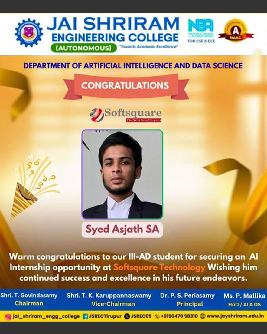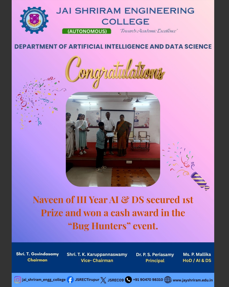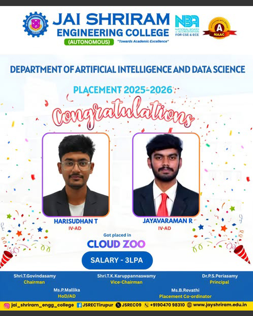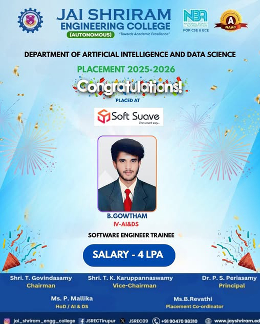 The Department of Artificial Intelligence and Data Science(AI&DS) is introduced in the year 2021 with an intake of 60 students. B.Tech (AI&DS) course is specially designed to enable students to build intelligent machines, software or applications with a cutting-edge combination of machine learning, analytics and visualization technologies.
