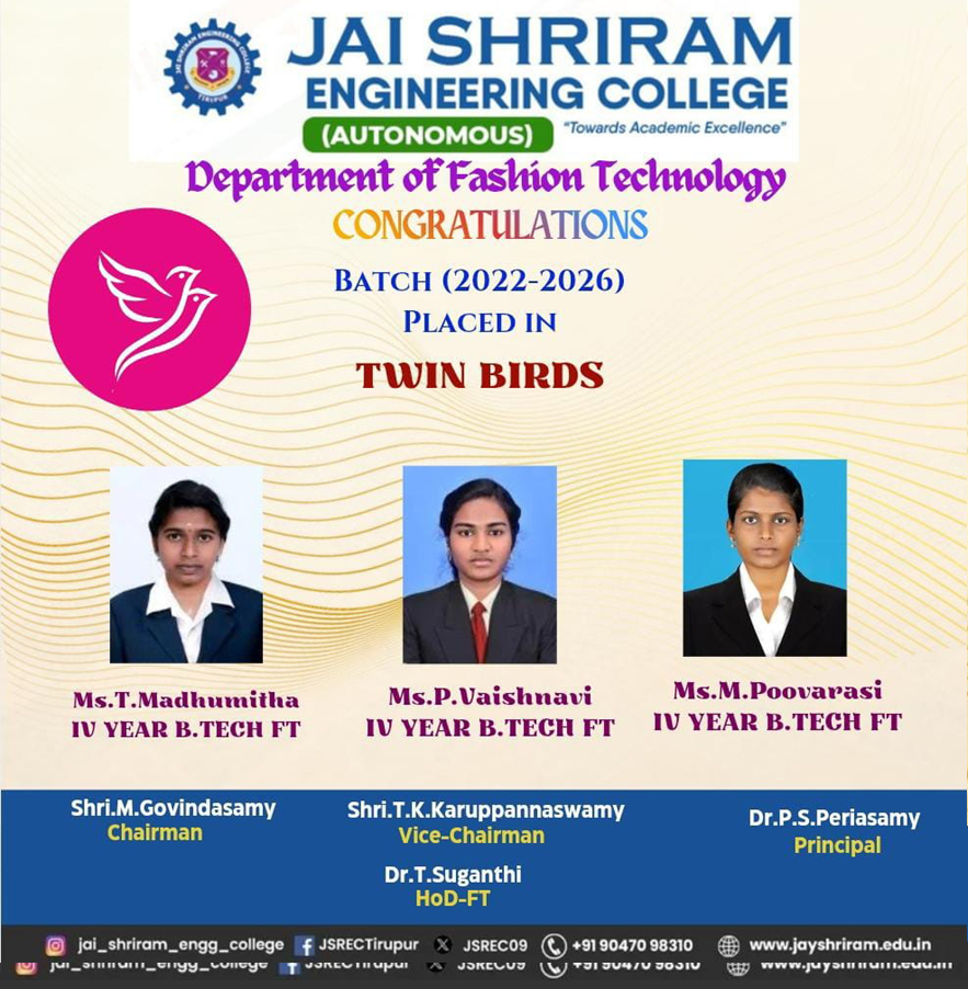 - The periodic industrial visits for the students to various textile and garment industries help to enhance their first-hand knowledge in their area of specialization.