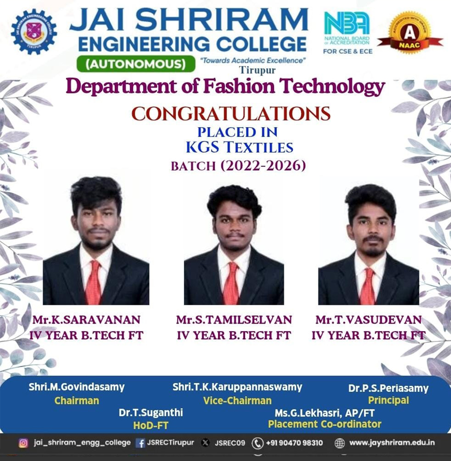 - PEO3: To imbibe management, leadership and team building skills among the graduates for shaping them as professional and entrepreneur in the discipline of Fashion Technology.