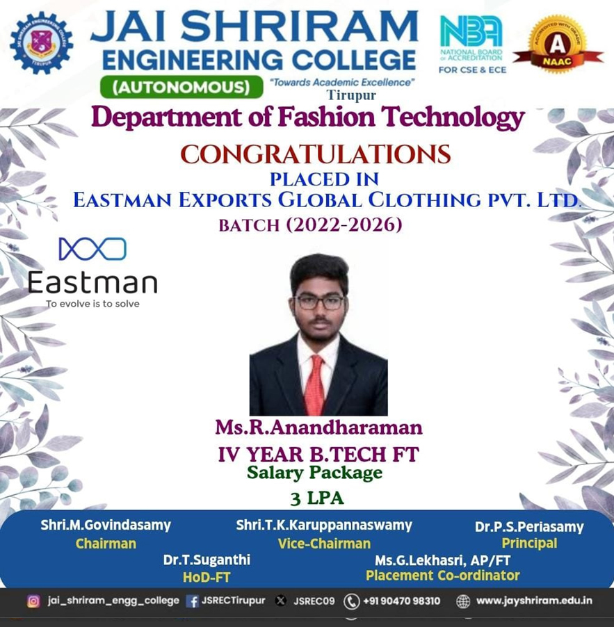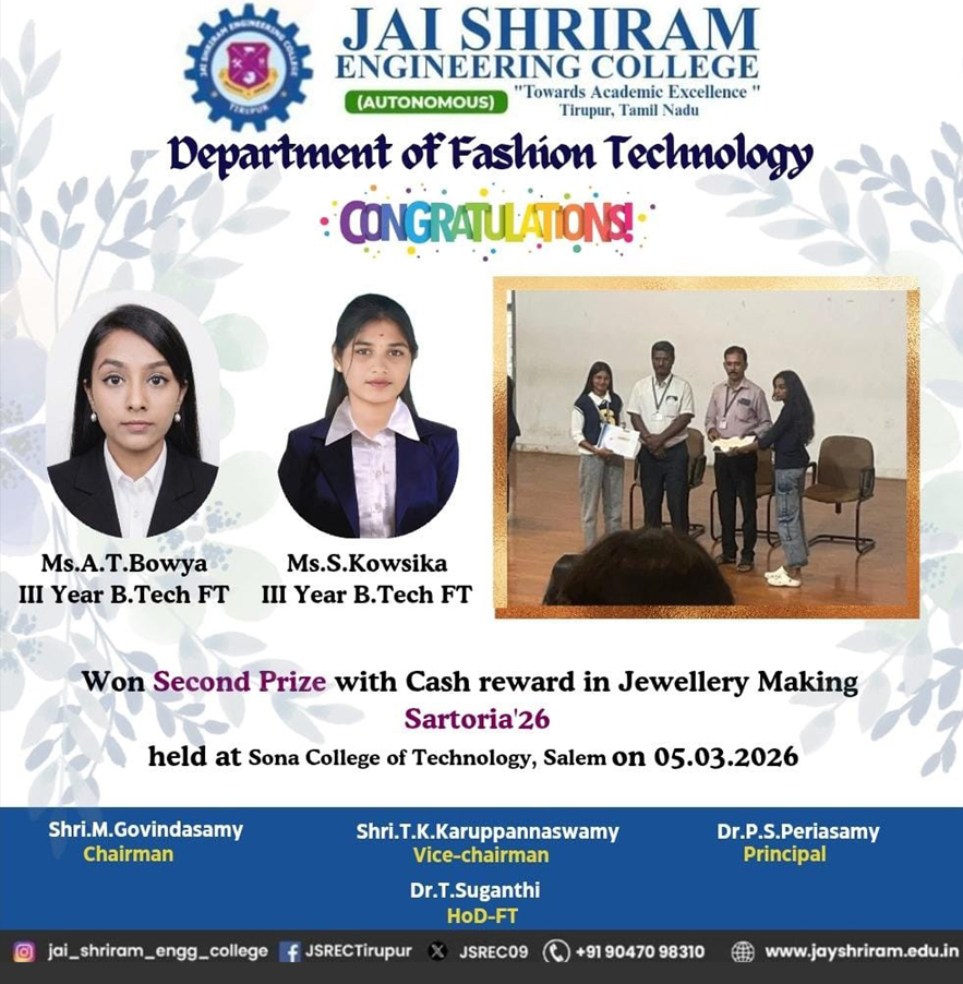 - PSO2: Apply the apparel domain concepts in apparel manufacturing to provide technoeconomic solutions for the real time problems to meet industry requirements with efficient financial and managerial skills.
