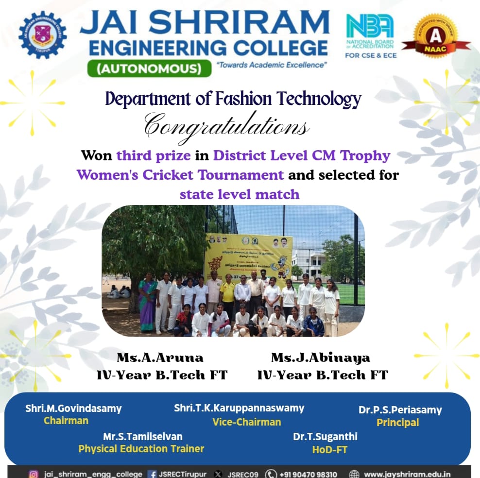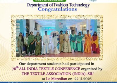 - The periodic industrial visits for the students to various textile and garment industries help to enhance their first-hand knowledge in their area of specialization.