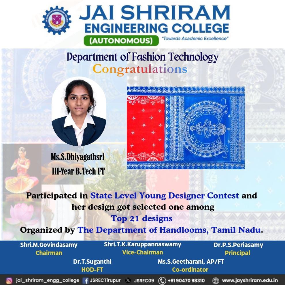 To equip the students excel in academic and research by bestowing technical competence and managerial expertise, enabling them to face the global demands of the clothing industry as an employable professional with social responsibility.