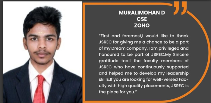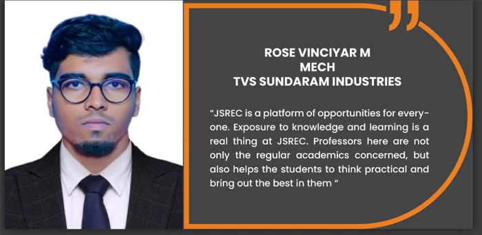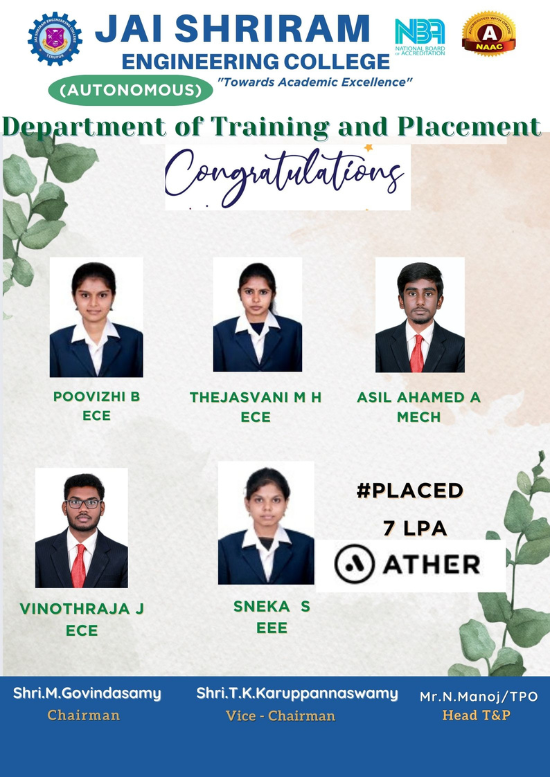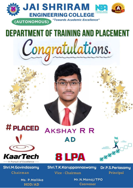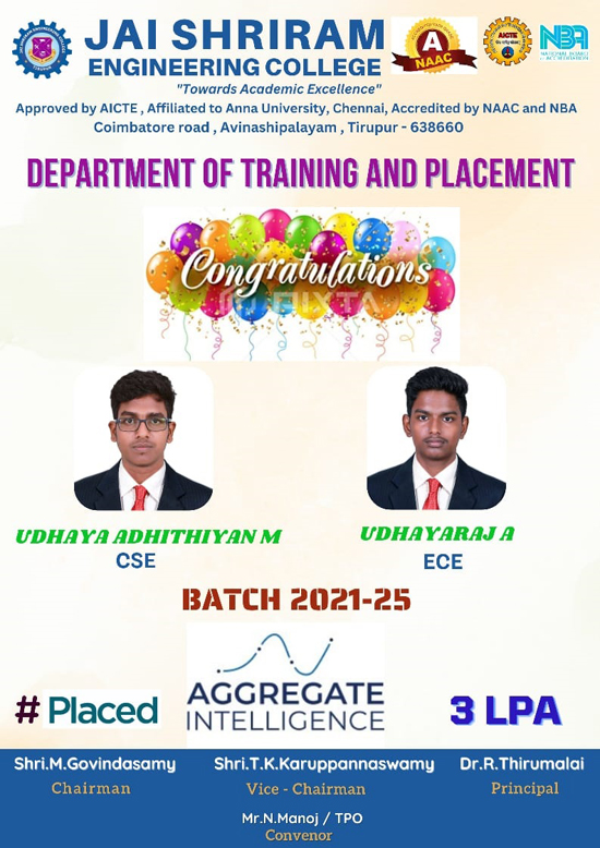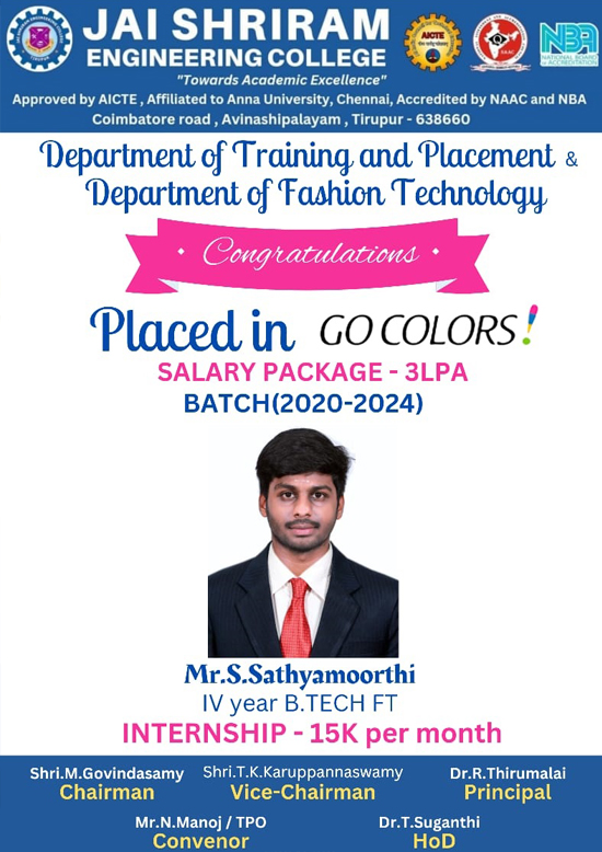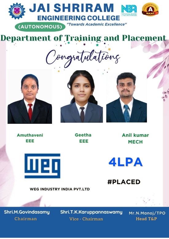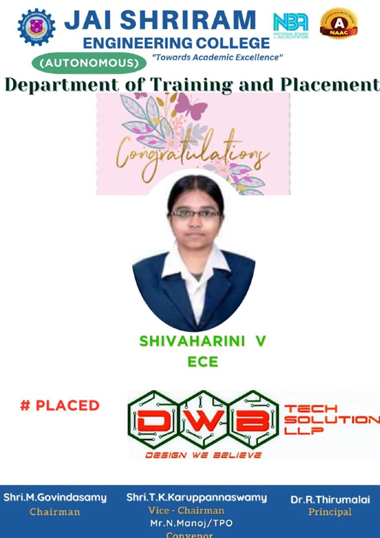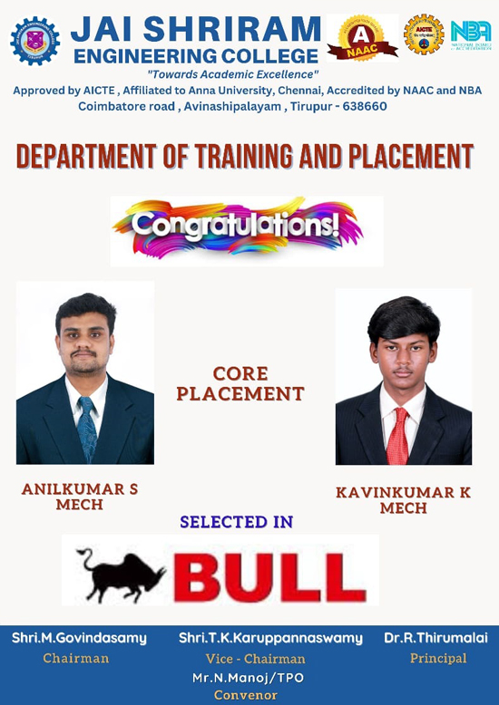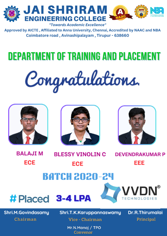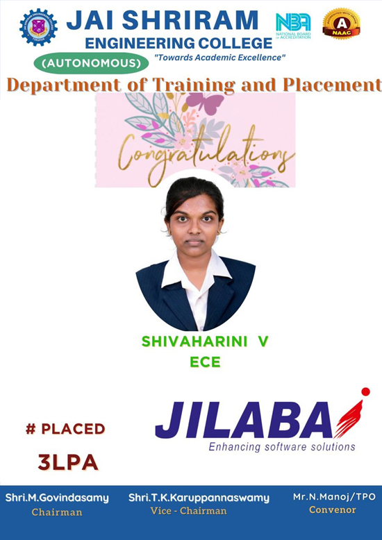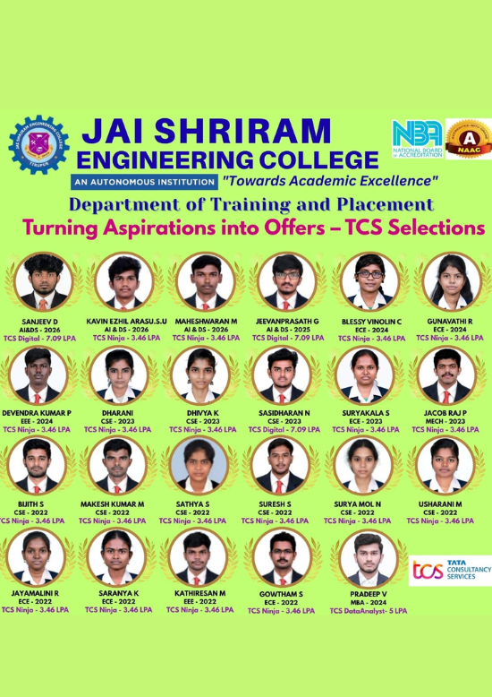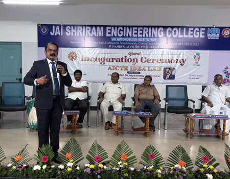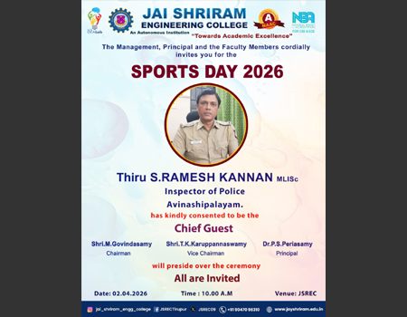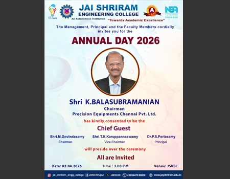 Jai Shriram Engineering College was endowed by Shenthil Velevan Trust in the year 2009 with a motto of equipping and implanting the seed of higher education blended with communal harmony to the rural community in and around the Textile City. JSREC reinforces to impart knowledge which are innards of a meaningful life.