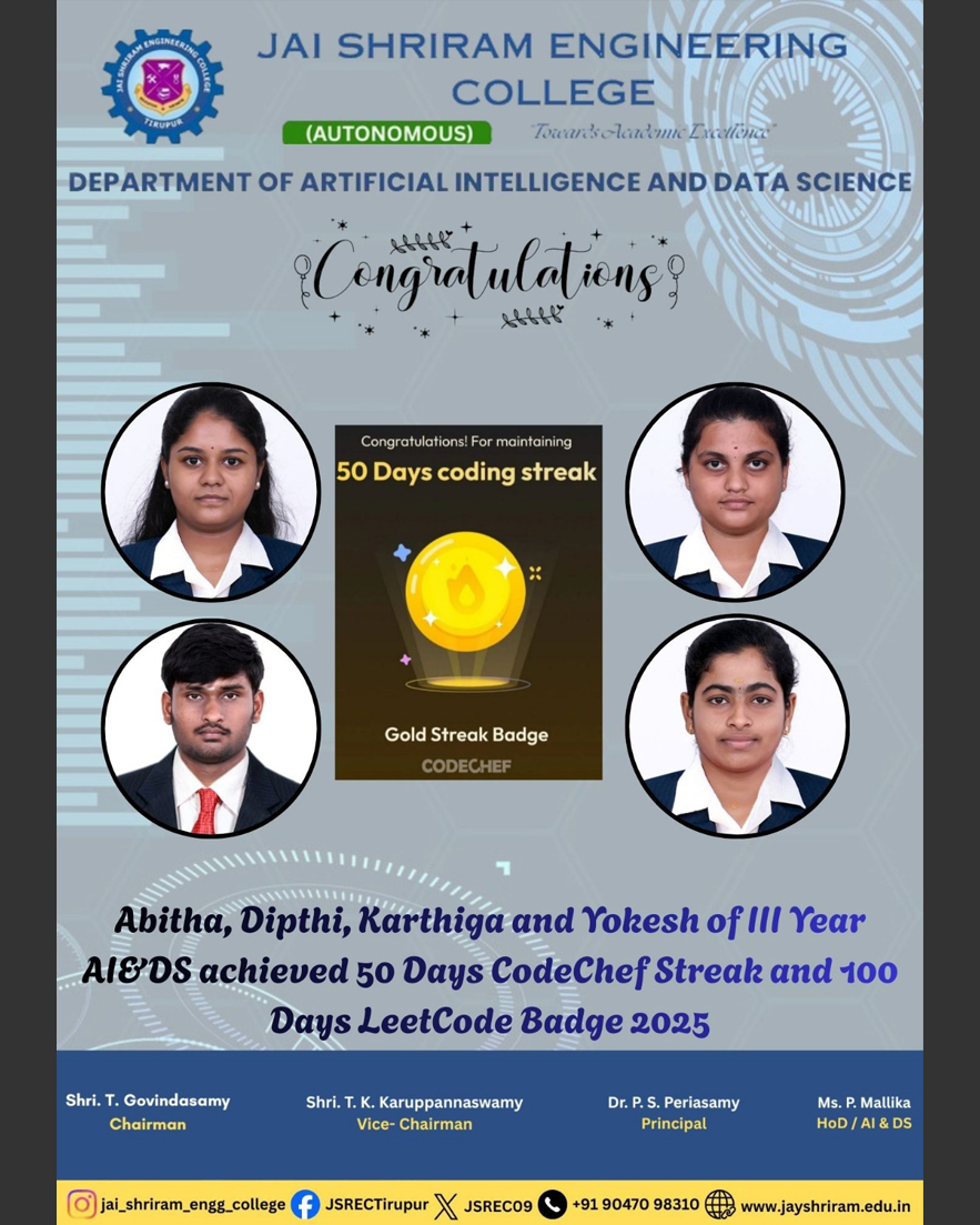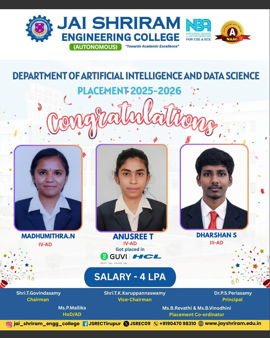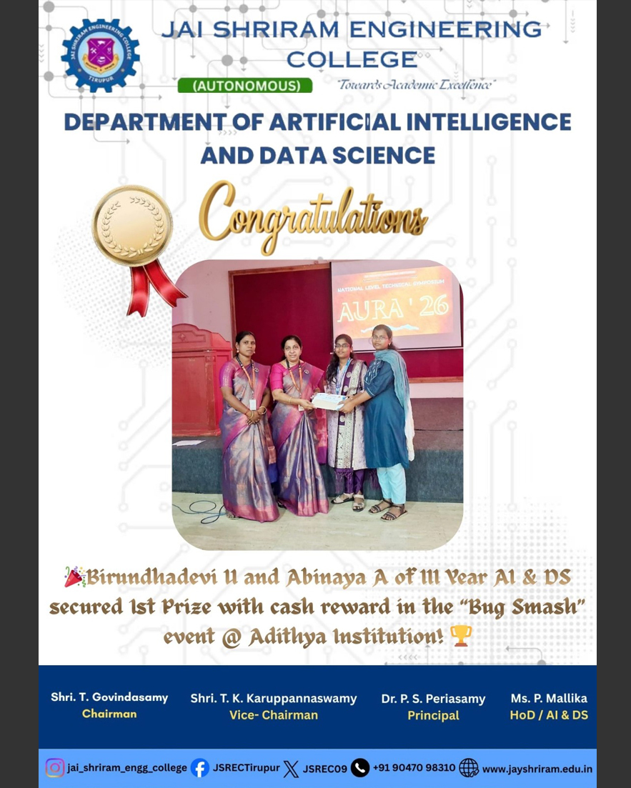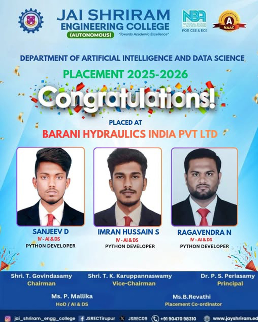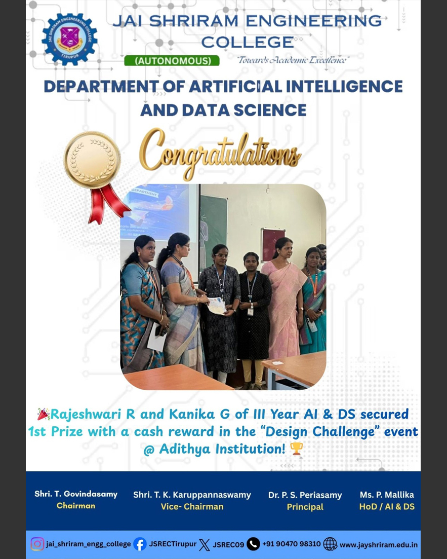 The Department of Artificial Intelligence and Data Science(AI&DS) is introduced in the year 2021 with an intake of 60 students. B.Tech (AI&DS) course is specially designed to enable students to build intelligent machines, software or applications with a cutting-edge combination of machine learning, analytics and visualization technologies.