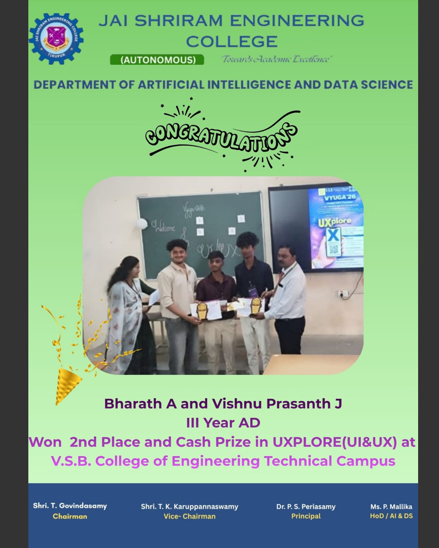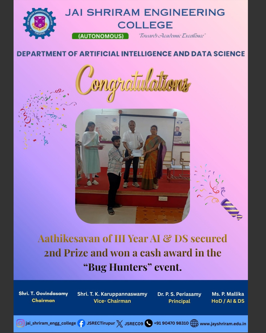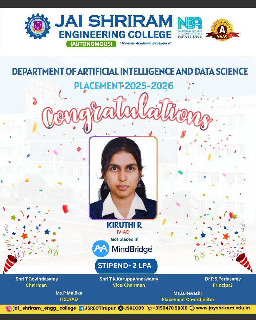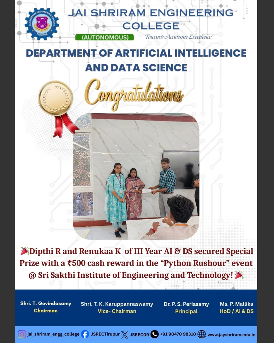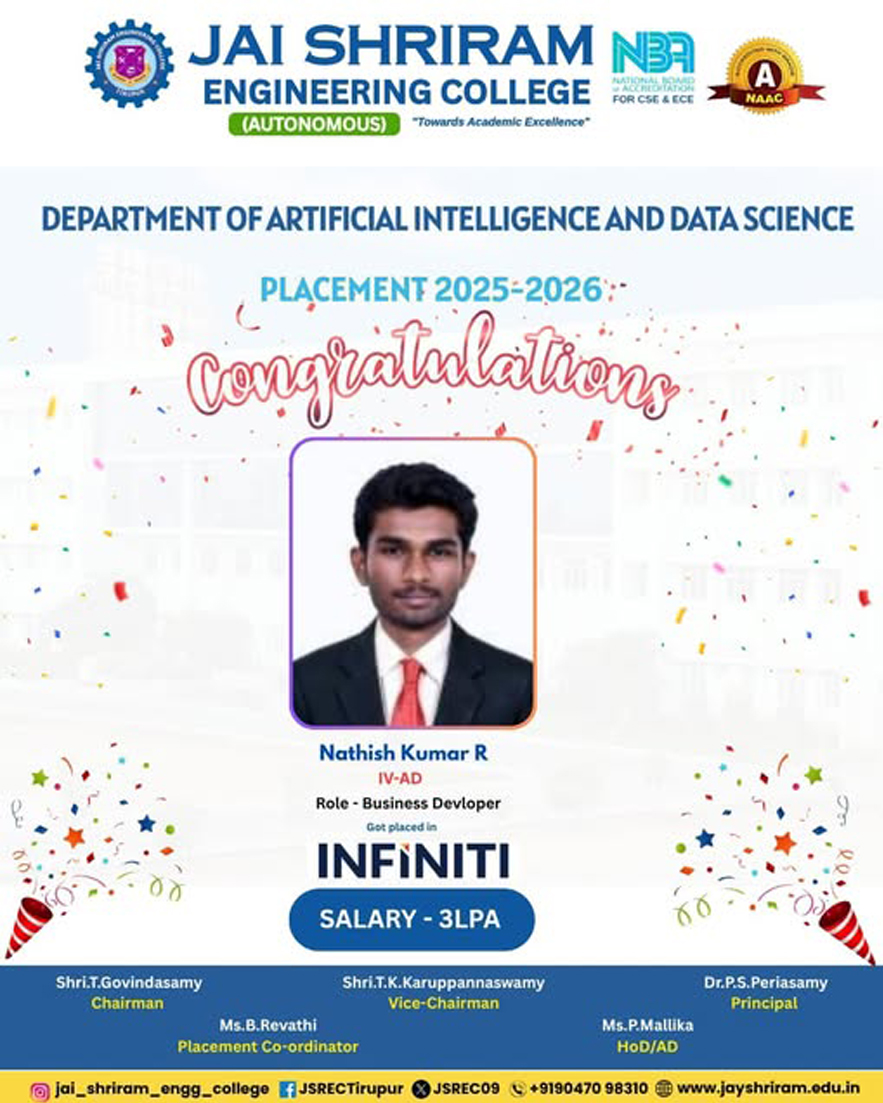 The Department of Artificial Intelligence and Data Science(AI&DS) is introduced in the year 2021 with an intake of 60 students. B.Tech (AI&DS) course is specially designed to enable students to build intelligent machines, software or applications with a cutting-edge combination of machine learning, analytics and visualization technologies.